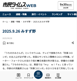 長野県松本市や塩尻市を含む中信地域を対象エリアとして発行されている新聞「市民タイムス」9月26日付のコラム「みすず野」で、片岡義男の『僕は珈琲』(光文社/光文社文庫)からエッセイ「刑事コロンボと珈琲」の一部が紹介されています。